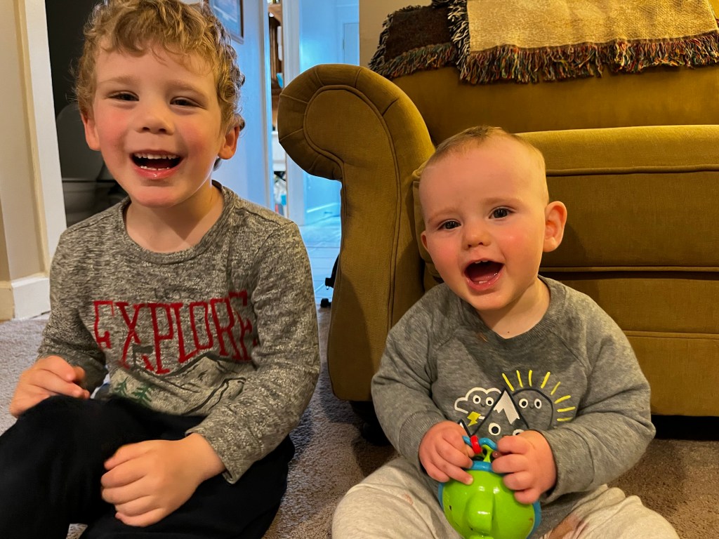 He loves the water, putting things in his mouth, laughs and squeals often, and looks up so adoringly to big brother Landon. Although Landon sometimes pesters Bryce in the car, he more often tries to make him laugh. Just yesterday I drove them home to the sounds of squealing, laughing and giggles, and when I looked in the mirror to see what was going on saw them looking and laughing at each other.
